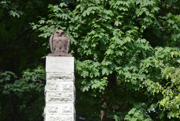 Lt: Neįprastos formos sargo namelis (Bažnyčios g. 20) su pelėda ir šalia esantys laiptai yra vieni iš nedaugelio išlikusių Frykų dvarelio akcentų. Šie statiniai sumanyti žinomo architekto Edmundo Alfonso Fryko. 1927 m. jis gyveno su šeima mediniame name Žaliakalnyje ir, norėdamas sutrumpinti kelią iki miesto centro, pasistatė medinius laiptus. Tuo metu laiptai buvo privatūs ir ne visi jais galėjo naudotis.