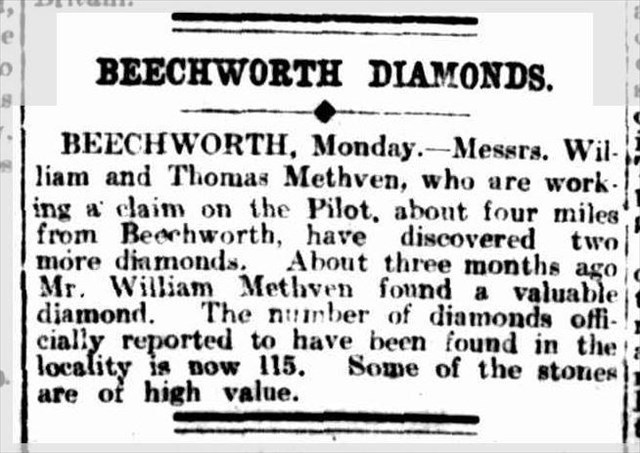 By 1917, prospectors who were still tilling over the sands of Reedy Creek for gold, were continuing to discover diamonds, but instead of tossing them back in the water, their discoveries were being reported in the newspapers (see article right, The Argus newspaper 25th Sep 1917)with some 5 ca diamonds that were discovered selling for as much as £175. These days similar diamonds would sell for as much as $50,000!