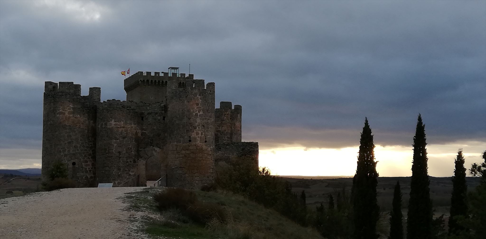 El castillo de Peñaranda es una gran fortaleza que domina de forma clara el caserío. Aunque las primeras defensas de Peñaranda pudieron ser levantadas de forma simultánea a su repoblación, la mayoría de lo actualmente conservado debe atribuirse al primer conde de (1), entre mediados y finales del siglo XV. Presenta una gran similitud con otros castillos de la comarca ribereña, como los de Peñafiel y Gormaz, y también repite el ventajoso emplazamiento entre un monte y un río, como se observa en Burgos, (2) o Castrojeriz. Su planta alargada y quebrada se adapta de forma perfecta al escarpado roquedo sobre el que se asienta, la famosa Peña de Aranda, ocupando aproximadamente la mitad occidental de la misma. La puerta de acceso se halla al Este, separada del resto por un foso excavado en la roca viva.