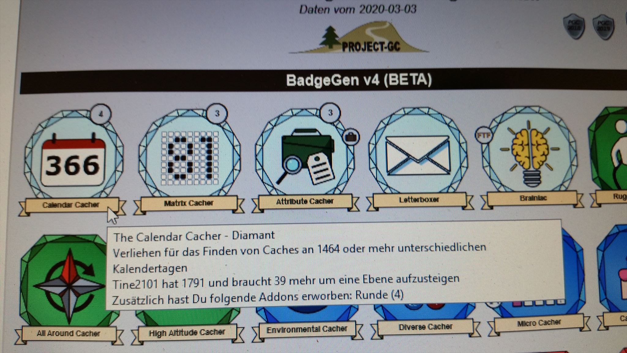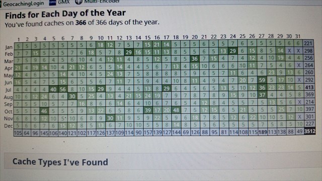 Wer also auch meint: "Aller guten Dinge sind drei" und tatsächlich an jedem der 366 Kalendertage mindestens 3 Caches gesucht und geloggt hat, der kann sehr gerne ein Foto/Screenshot der Tagesmatrix oder von GC-project hochladen. Ich würde mich sehr darüber freuen.