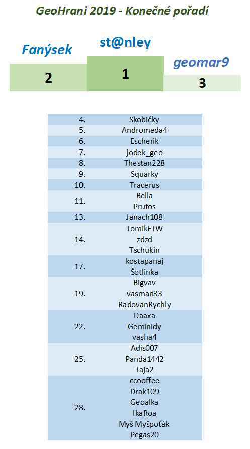 Tahle keš vznikla jako vzpomínka na sérii herních eventů (jednalo se o 8 hracích a jeden "vyhlašovací" event) v roce 2019, které jsme pořádali pod názvem GeoHrani 2019. Soutěží a her na těchto eventech se zúšastnilo celkem 33 různých kačerů (někteří jednou, někteří vícekrát a někteří pravidelně). Za vítězství na eventu byla odměnou trakovatelná medajle speciálně vytvořena pro daný event a dále se za umístnění sbírali body do celkového hodnocení a na konci roku jsme odměnili deset celkově nejúspěšnějších kačerů.