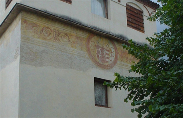 Si può avanzare l’ipotesi che l’edificio sia stato eretto al confine delle proprietà locali delle due famiglie e decorato in seguito alla soluzione di una contesa territoriale o di altro genere (Rigon 1982). Altri otto piccoli stemmi, due per facciata, sono disposti sotto quelli principali. In mancanza di documenti e in base a un’analisi stilistica si può ipotizzare per l’edificio e la sua decorazione una datazione al xv secolo.