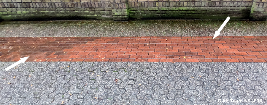 In der Aufnahme des Listingbildes seht ihr eine farblich abgesetzte Pflasterung (rötlich) und die soll uns virtuell die ehemaligen Fundamente eines Teils der Stadtmauer zeigen. Wenn ihr die Position der Aufnahme gefunden habt, gibt es in der Nähe noch weitere Informationen dazu.