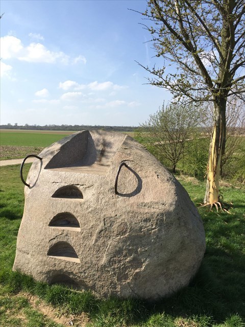 “Verborgen in het landschap ten westen van Maastricht liggen de sporen van een rijke geschiedenis, evenals een unieke geologie en speciale flora en fauna. De veertien oriëntatiepunten vestigen de aandacht op deze dingen. Mijn concept is een combinatie van een paar basiselementen: een rotsblok, een informatiepost en een boom bij elke bezienswaardigheid. Zitplaatsen werden uit de kolossale granieten keien gebeiteld (5-10 ton). Keien zijn het tijdloze aspect in het kunstwerk en de 'x' die de plek op de kaart markeert. Ze dienen ook om het verhaal van de regio betekenis te geven. De "grensposten" dragen informatie over een roterende kubus en de vorm van de paal is geïnspireerd op de gietijzeren paaltjes die overal in dit gebied worden gevonden. De boom is een mijlpaal dat zichtbaar is vanaf grote afstand en, net als mensen, de tijd in jaren bijhoudt. Naarmate de boom groter en breder wordt, groeit ook de voor de hand liggende prominentie van die site…”