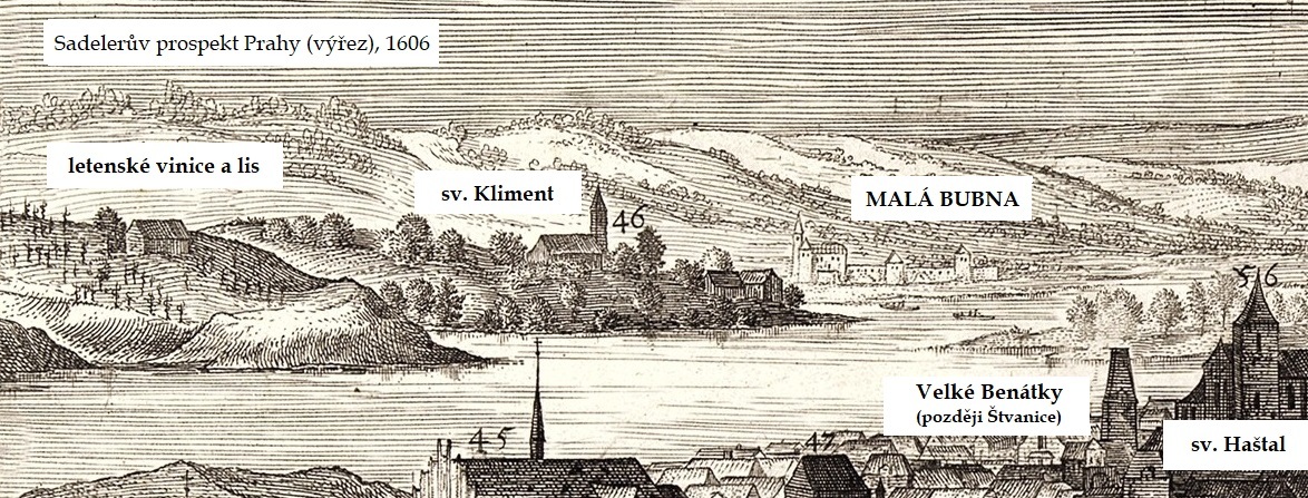 Malá rybářská a vinařská víska s přívozem se koncentrovala v místech mezi dnešním předmostím Hlávkova mostu a Strossmayerovým náměstím, na úpatí svahu Slunečního vrchu (= Leteň, Leteňské pole), který ke vsi patřil, a kde se kromě pěstování révy už jen pásly ovce. Na tzv. Sadelerově prospektu Prahy z roku 1606 je vyobrazený přívoz střežený mohutně opevněným dvorcem. Ves ze severu od okolí oddělovalo několik roklí, ta nejbližší (soudě podle jejího názvu Čertovka) vybavená místním strašidlem; okolním pastvinám se říkalo Na Čertoušku. Bez půvabu není ani zaznamenaná snaha Bubenských vysušit studánku v hájku za vsí (ulice "U studánky"), protože se u ní děly rejdy rarášků a lesních žínek. Kdo by si to tu dnes pomyslel :) Vísku tvořily nejprostší domky a pouze pár větších staveb - zeměpanský dvůr ("Malá"? Bubna), ke kterému později přibyl i pivovar, a trochu stranou stojící kostel sv. Klimenta. Pod pavilonem restaurace z výstavy EXPO 58' se zachovaly viniční sklepy - dnes chodíme po jejich střeše a máme je za vyhlídkovou plošinu. Mimochodem, na letenské víno se dochovala i stručná recenze z roku 1451, kdy jím byl pohoštěn papežský legát Eneáš Silvio Piccolomini, pozdější papež Pius II.: »Víno jest nechutné a nepěkné barvy.« Ten pán byl ovšem ze své pozice katolického vyjednavače v "kacířských" Čechách nutně zaujatý... :)