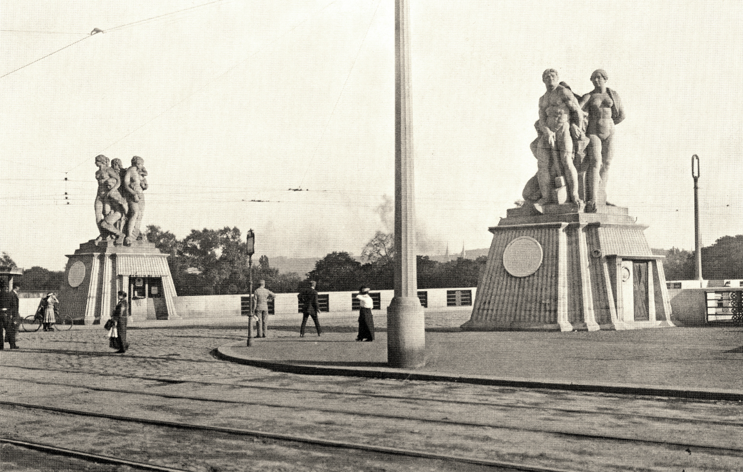 2) Nacházíte se na břehu řeky u alegorického sousoší "Práce". Na protější straně ho doplňuje ještě sousoší nazvané "Humanita". Asi málokdo by podle jejich vzhledu tipoval, že tu tyto sochy stály už za císaře pána - sochař Jan Štursa je dokončil v roce 1913. Ve tváři obra nad vámi, toho s kamenickou palicí, se zračí sochařův autoportrét.