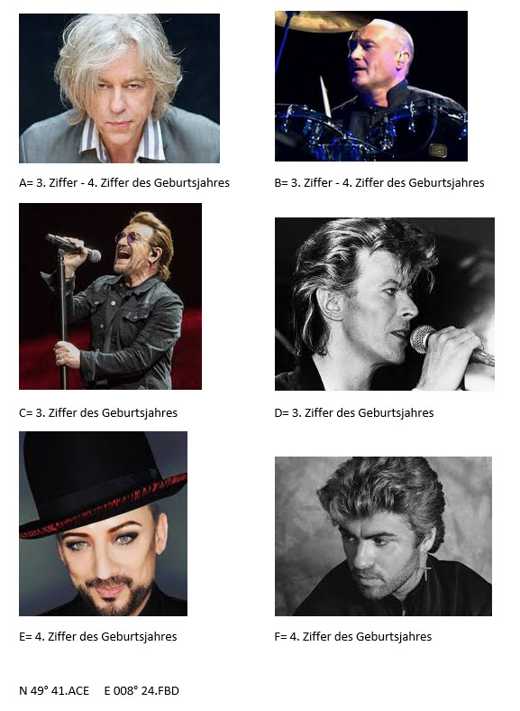 Einige davon sollt Ihr hier erraten. Da es bei Künstlernamen nicht immer so einfach ist und sich so manchen über die Jahre neu erfunden hat, mal mit mal ohne Band unterwegs war, braucht Ihr für die Berechnung das jeweilige Geburtsjahr der Künstler.