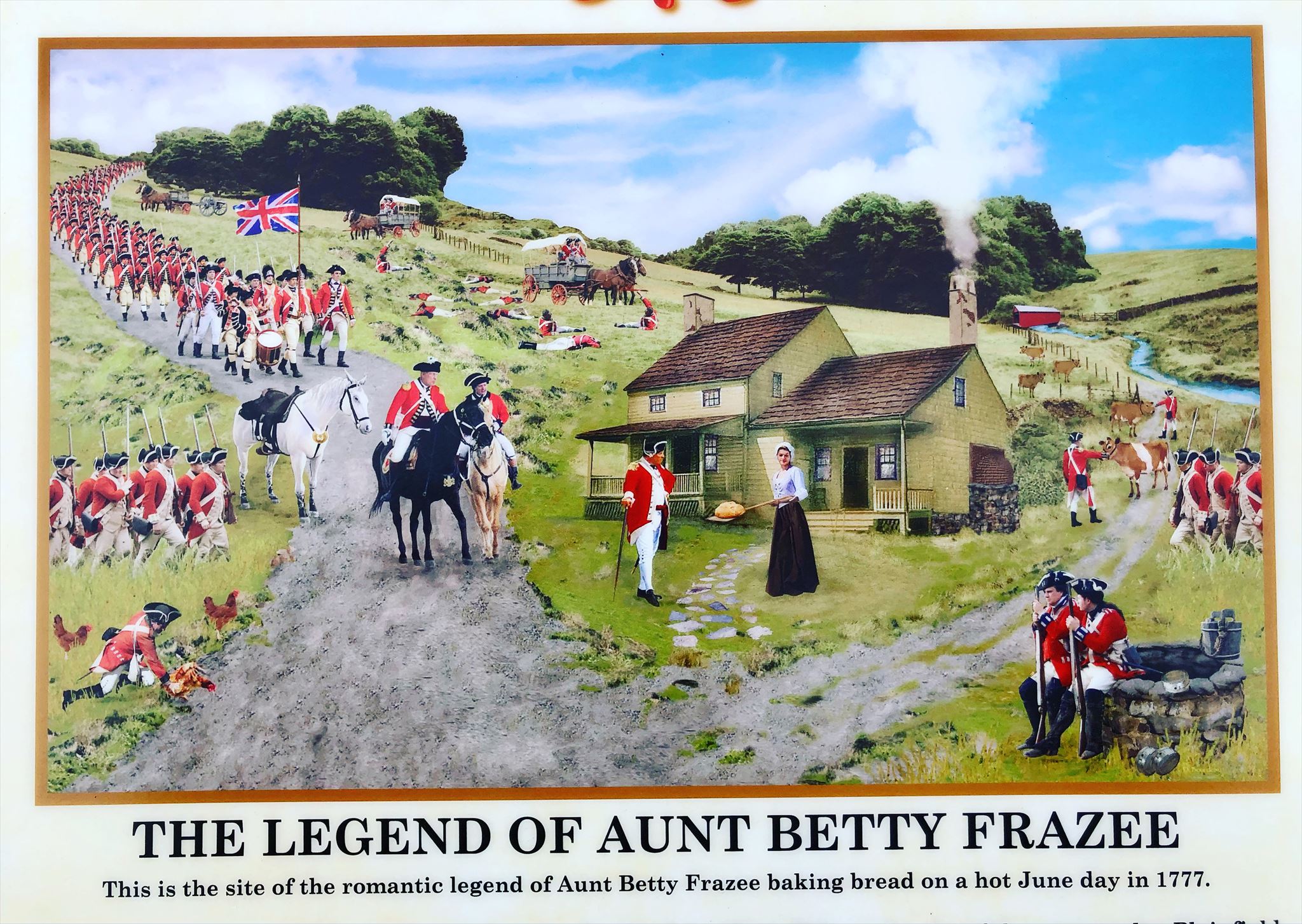 During the Revolutionary war Gershom and Elizabeth "Aunt Betty” Frazee lived in a modest house. The Frazees fed and housed militia troops under Captain Eliakim Littell in February 1777.“Aunt Betty” Frazee was was a bread baker and known to locals in the area as such. The Battle of the Short Hills had just been fought in the nearby Ash Swamp. It was close enough that she would have been able to hear the cannon fire and smell the gunpowder. It is thought that she was actually baking bread intended for the Continental Army’s troops. Apparently the appetizing aroma of the bread led him and another high ranking officer to the house.