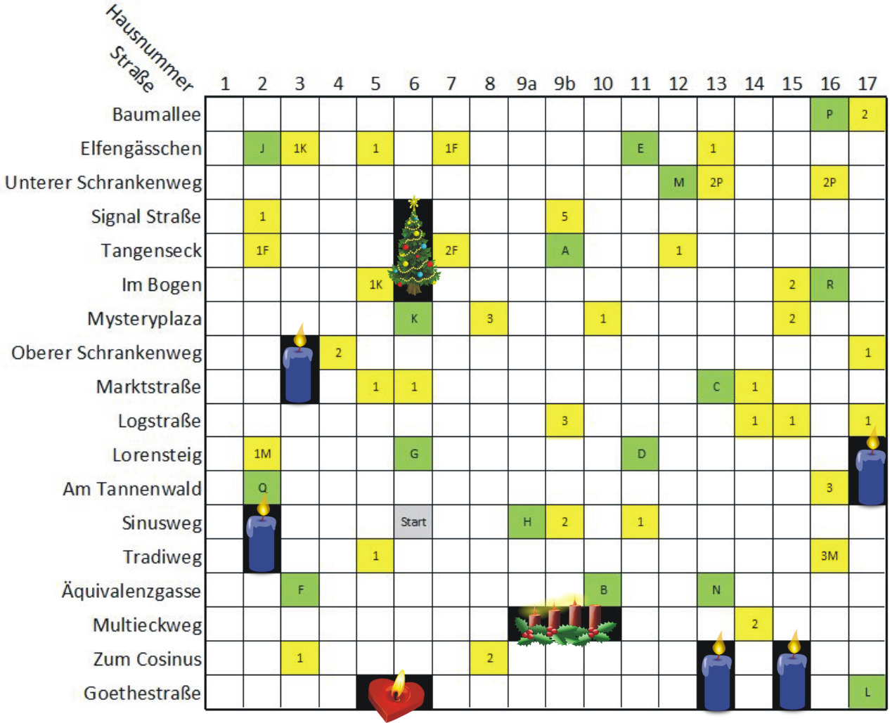die dicke Berta ääääh Berta wohnt in der Äquivalenzgasse 10... das ist also kein Problem. Mit den Geschenken ist schon schwieriger. Die zahllosen Zettel fliegen irgendwo im Auto herum. Er weiß noch, dass für Fritz der Bohrhammer im Tangenseck 2 zu holen ist, der Werkzeugkoffer im Elfengässchen 7 und die Tischkreissäge im Tangenseck 7. Ausgerechnet dort ist auch noch Weihnachtsmarkt, so dass er das Tangenseck nicht einfach entlangfahren kann. Wenn er die Sachen eingeladen hat, sind 4 Paketeinheiten belegt. Hmmm, nimmt er vorher noch etwas mit oder sammelt noch andere Sachen ein...? Er ist sich noch nicht sicher.