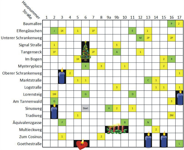 Nachdem ihr das geübt habt, wird das Schema in ähnlicher Art auf die Beladung von Hugos Kastenwagen angewendet (Beispiel: der Kastenwagen ist für Louisa mit 2 Paketeinheiten und für Emil mit 3 Paketeinheiten beladen, dann 12x2 + 5*3 = 39). Die Summe der Beladung im Feld Am Tannenwald 14 ergibt die Zahl X, im Feld Mysteryplaza 7 die Zahl Y und im Feld Baumallee 15 die Zahl Z.