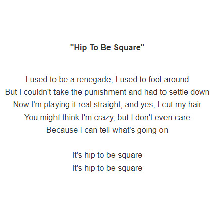 Hip to be Square was a mega hit for Huey Lewis and the News, though the number "only" reached third place on Billboard's hit list. The album the song was taken from was called Fore! A very fitting name for their fourth release. Stuck with You, Jacob's Ladder and Hip to be Square were the three biggest hits of the album, and the first two hit the top of the charts. A total of six singles were released in all from Fore! Five of them reached the top-10 on the Billboards Hot 100.