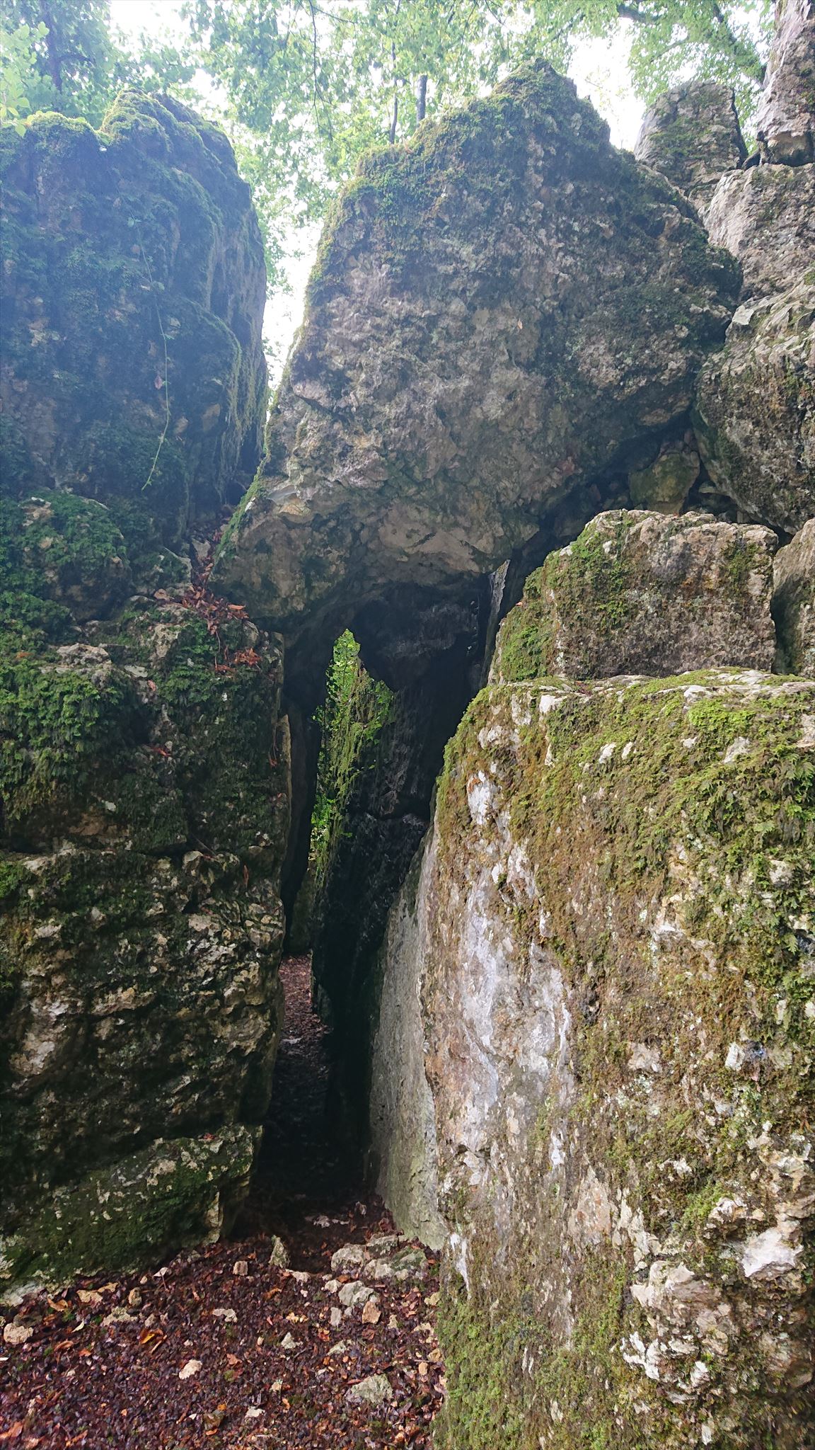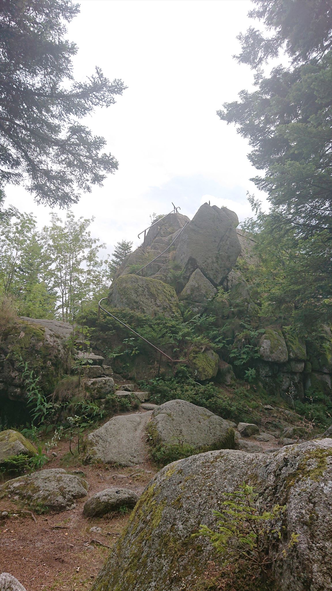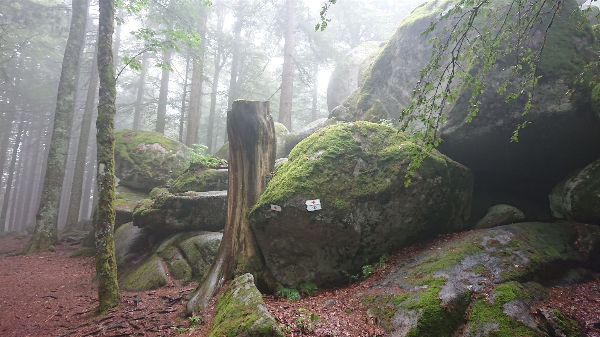 Mystisch bei Nebel: der E = _ _ _ _ _ _ felsen (hier erkennt man übrigens die rote Raute – mein ständiger Begleiter auf dem Weg).