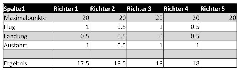 Ich hoffe, ihr habt den Sprung von Springer 1 gut beobachtet und alle oben aufgeführten Bewertungsrichtlinien beachtet. Dazu hattet ihr etwa 10 Sekunden Zeit. Vier Punktrichter haben bereits ihr Ergebnis für Springer 1 an die Rechenabteilung geliefert. Tragt euer Ergebnis für seinen Sprung in die Tabelle ein: