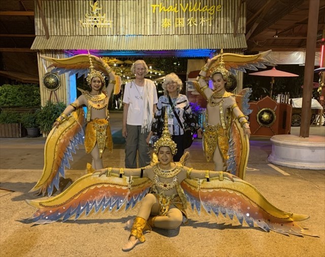 Back at the hotel, we had time to clean up and change clothes before getting on the bus to Siam Niramit to see a state-of-the-art cultural performance. A large buffet dinner (with far too many choices) was included before the show. As we walked from the restaurant to the 2A00 seat performance theatre, there were four villages to walk through that portrayed four regions of traditional Thai lifestyle. Inside, we enjoyed a spectacular performance of Thailand's arts and cultural heritage staged by more than 150 performers with as many as 500 costumes. As we were leaving, three of the "angels" offered to have a photo taken with us.