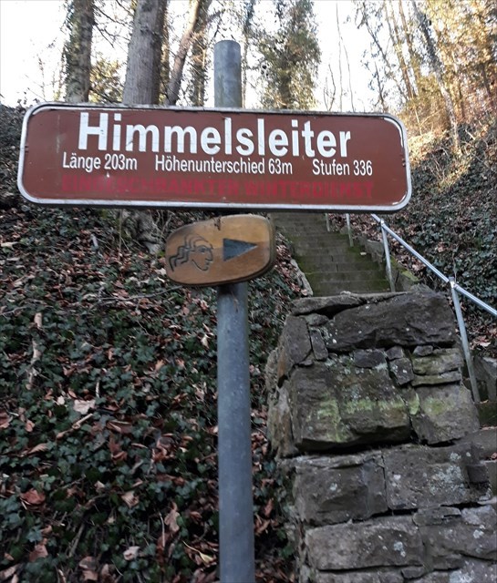 Die Himmelsleiter verbindet den Mörlagraben mit dem Weg Unterm Hain. Sie ist 203 m lang. Mit 336 Stufen übrrwindest du 63 Höhenmeter. Etwa auf halber Strecke kommst du an einer kleinen Kapelle vorbei.