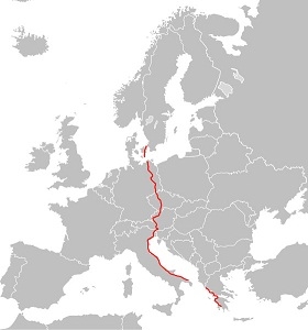 EN: European route E 55 is a E-route. It passes through the following cities: Helsingborg … Helsingør – Copenhagen – Køge – Vordingborg – Nykøbing Falster – Gedser … Rostock – Berlin – Lübbenau – Dresden – Teplice – Prague – Tábor – Linz – Salzburg – Villach – Tarvisio – Udine – Palmanova – Mestre – Ravenna – Cesena – Rimini – Fano – Ancona – Pescara – Canosa – Bari – Brindisi … Igoumenitsa – Preveza – Rhion – Patrai – Pyrgos – Kalamáta.From Helsingborg, the route was supposed to continue northward through Sweden and into Finland, although there, for practical and sentimental reasons, it retains its former number, E 4. Length: 3,305 km (2,054 mi)