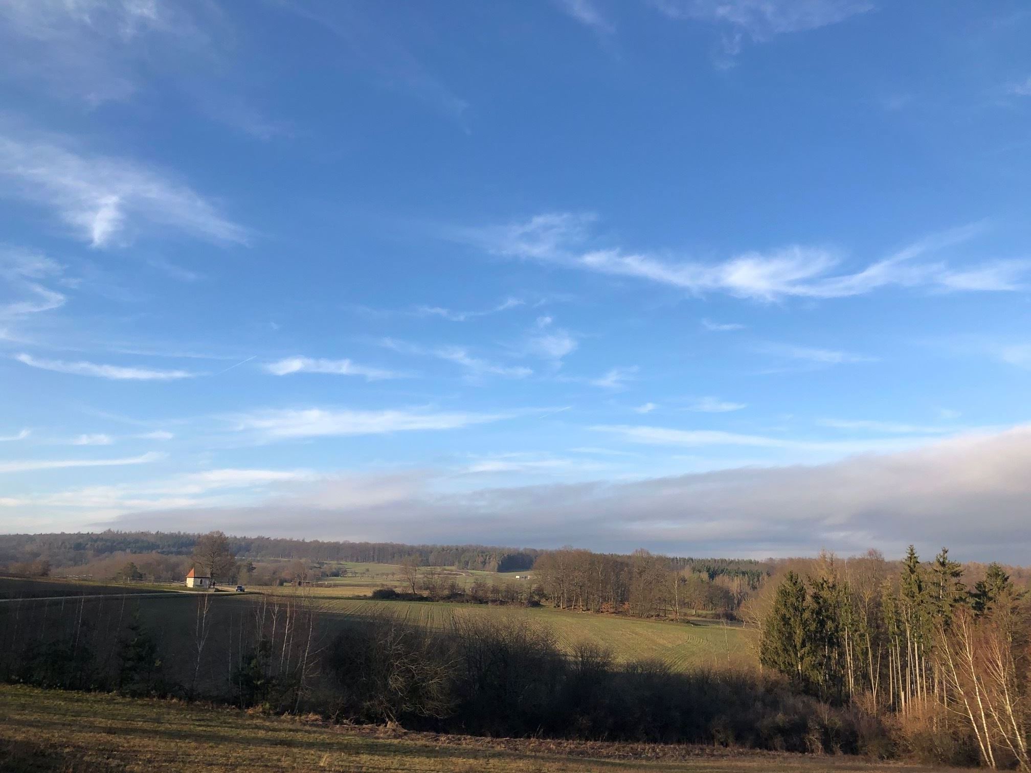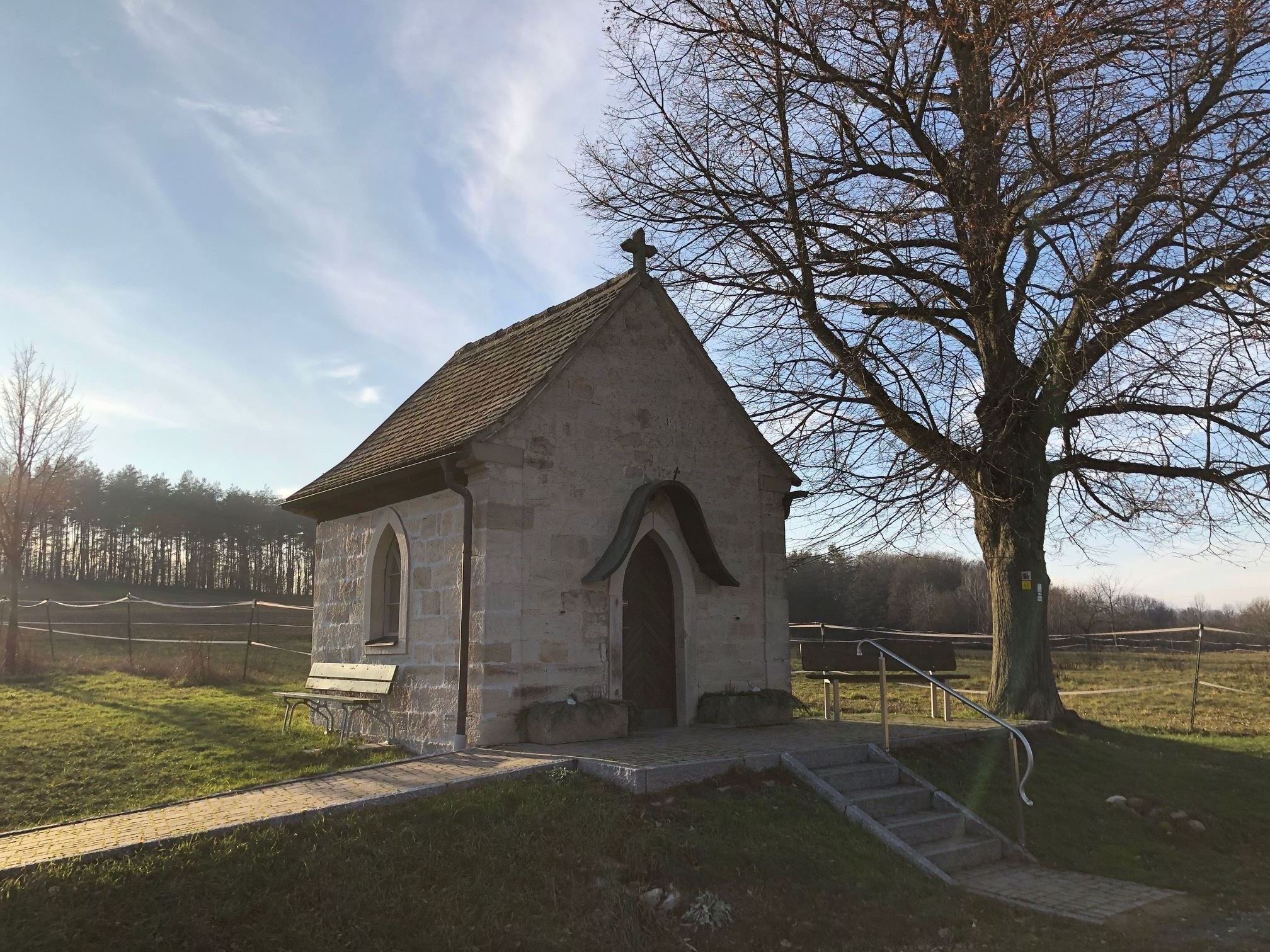 The Oberschleichach high planes. A leisurely walk that is extremely popular with parts of the family. Whether in winter, spring, summer or autumn, the high plane walk is always an option. And there it stands in the middle of the plateau, flanked by a large linden tree. The nameless little chapel (actually translated from Frankonian it should be chäppele). Little can be found about its history, the local list of monuments has it as a "waychapel" in Oberaurach, Oberschleichach-Kohlberg. The only additional information Wikipedia offers is polygonal hipped roof construction from sandstone blocks, neo-Gothic, erected in 1912. However, the chapel is actually much nicer than this sounds!