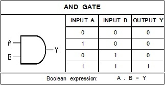 Digital gates are comprised of combinations of transistors to perform specific tasks and give a specific output with one or more digital inputs. Each logic gate type has its own symbol and boolean algebraic equation. Set out below are four types of logic gates, with their associated truth tables. A truth table shows what the output value Y will be for any given set of input values (a shortcut so that you do less maths).
