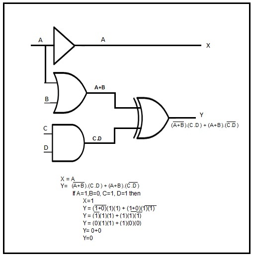 If A, C, and D are true inputs (vaue of 1) and B is 0 you will get X and Y output values as worked out below.