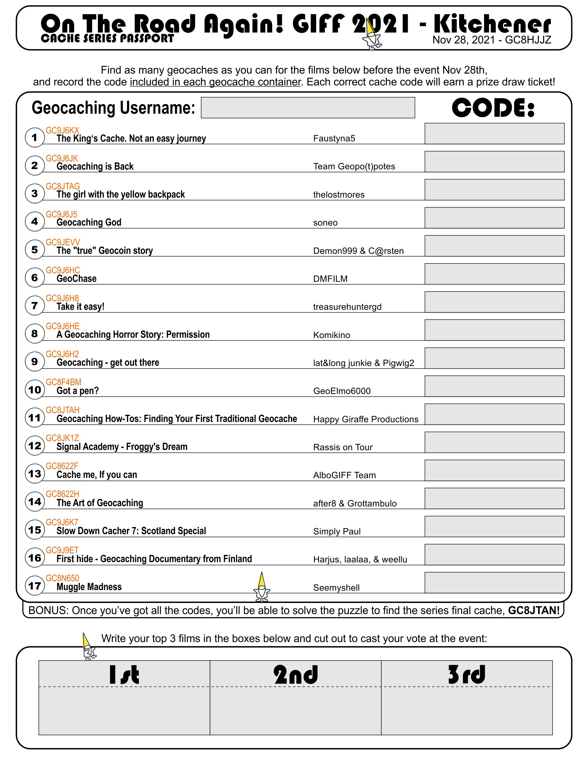 For anyone who hasn’t attended an official GIFF event, you can earn the GIFF 2021 souvenir for your geocaching profile by watching the videos on Youtube and discovering the TRACKABLE CODE hidden within!