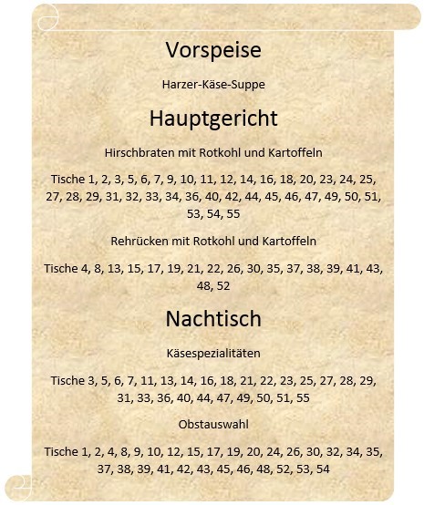 In diesem Gebäude wurden früher Abendgesellschaften abgehalten. Für die Hauptspeise und den Nachtisch konnte aus 2 verschiedenen Gerichten gewählt werden.