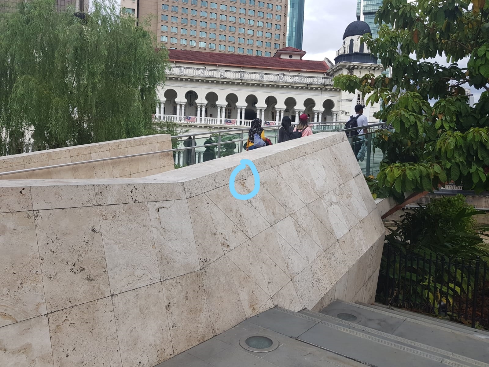 The posted coordinates brings you to the Masjid Jamek Pedestrian Bridge, over the River of Life. The bridge is cladded with a type of limestone called travertine, and in it you can see various fossils as highlighted in GC89972. With closer inspection of the bridge, you will notice the the colouration throughout is not the same. And if you look carefully, the way the crystals appear in these dark spots are very different.