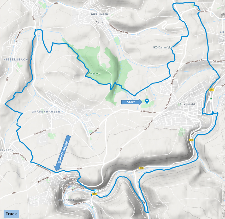Die Strecke folgt weitestgehend der Gemarkungsgrenze (oder der Gemeindegrenze, da bin ich mir von der Terminologie her nicht sicher) der Gemeinde Birkenfeld (Enzkreis) mit den Ortsteilen Birkenfeld, Gräfenhausen und Obernhausen . Und das ergibt exakt 29,6 km. Und so sieht die Strecke dann aus ....