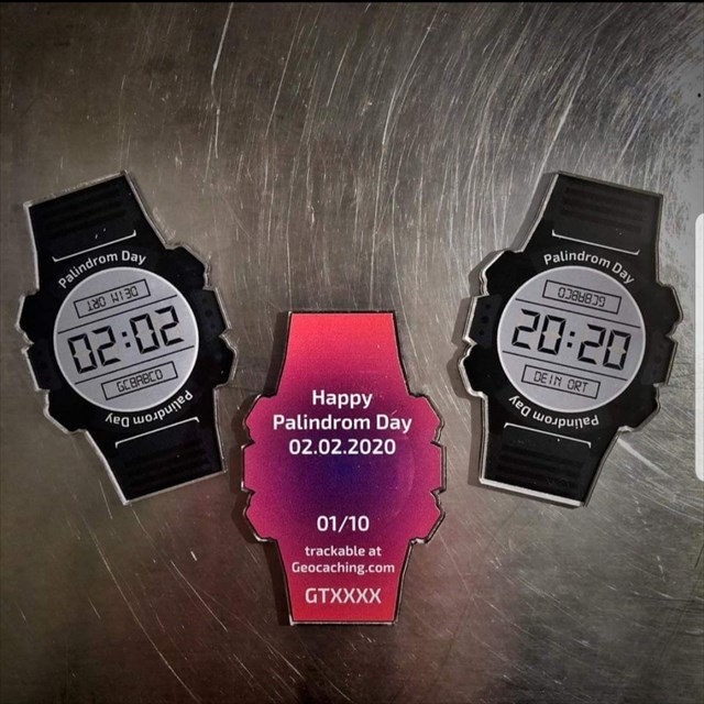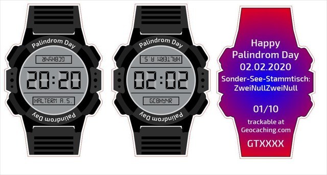 Ich habe die Absicht, zu diesem "Palindrom-Day" einen eigenen trackbaren Token in einer limitierten Auflage von 20 (natürlich!) Exemplaren produzieren zu lassen (s. nachfolgendes Bild). Dieser Token besteht aus Kunststoff, ist ca. 7 cm hoch und 4 cm breit; durch Drehen des Tokens wird aus der "02.02." eine "20.20". Der Preis liegt bei 5 Euronen pro Stück.