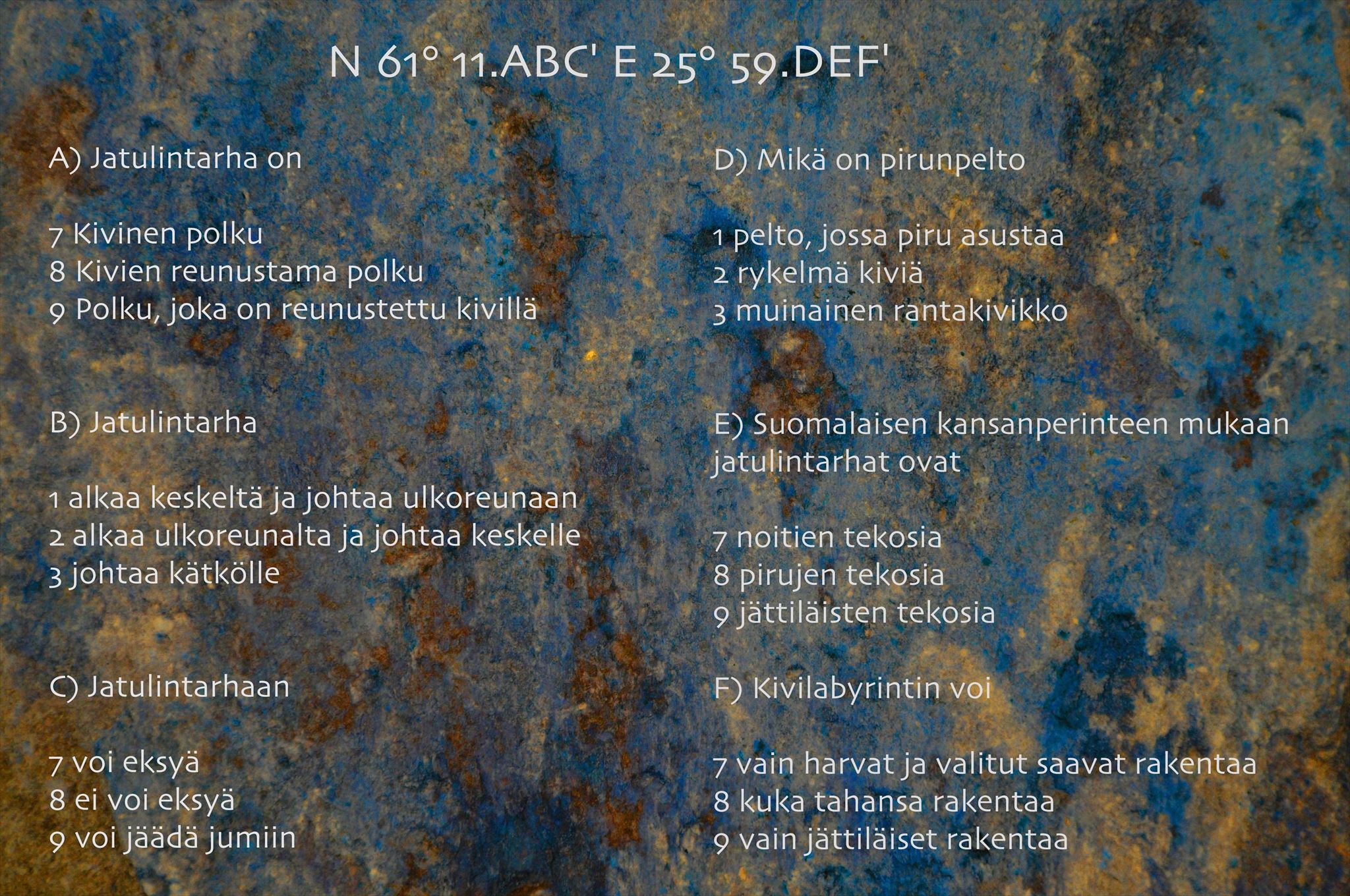 Pysähdy paikalla tärkeällä, siin kivikehän keskellä. Sit käppäile rantaan kiven ja paksuimman petäjän välistä. Siel kuoleva koivu on onnessaan kätköstä.