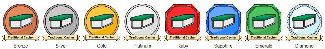 There are badges awarded for many things, such as finding a 5 difficulty cache, attending a geocaching event, working on completion of the difficulty/terrain grid, or uploading photos to logs. There are over 40 different badges! However, each badge exists on 8 different levels, starting with bronze and ending with diamond. The more caches you find, the higher the level you can potentially achieve as you work your way up to the diamond level.