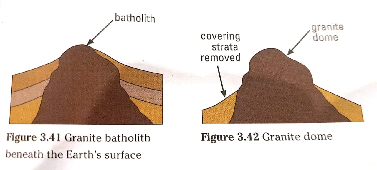 A Batholith is a large dome shaped intrusion of magma which occurs at great depths beneath the earths surface. The magma cools slowly to form large masses of rock usually granite with no bedding plates.