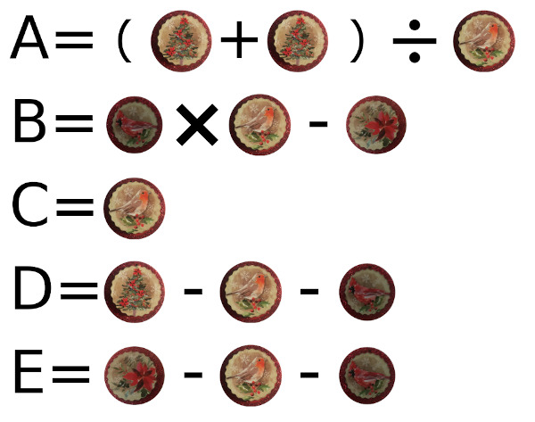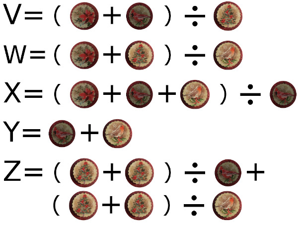 For each stage one ornament design, get the "word value / digital root" (summed to a single digit) of that cache's final stage code word to substitute for the designs in the formulas above. If you are unfamiliar with word value / digital root, see the geocachingtoolbox (.com) and look for their Word value (Digital root) tool under the "Text functions" header to help you out. (The standard A = 1 ... Z = 26 method is assumed. If you have a code word with a space in it, just enter it in with the space included, since spaces are treated as zero and will not change the calculation.)