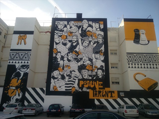 Este caché en concreto nos lleva a un grafiti monumental en un edificio recayente a un descampado en la calle San Amador de Torrent, junto a la parada de metro. Su artista es NSN997 y su título “Positive”. Creado en diciembre de 2019.