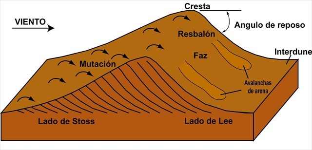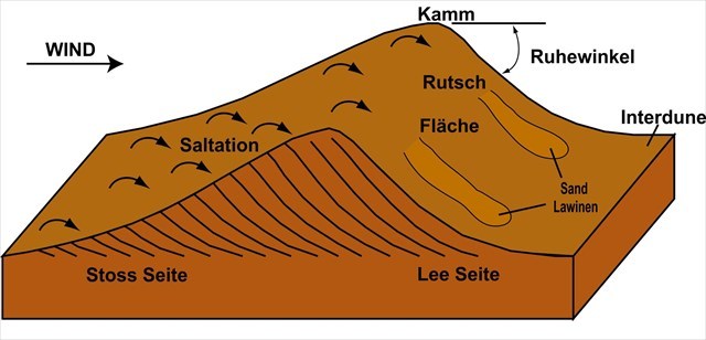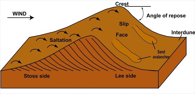 Dünen bestehen aus sandgroßen Partikeln und können aus Quarz, Calciumcarbonat, Schnee, Gips oder anderen Materialien bestehen. Die aufwärts gerichtete Seite der Düne wird die stoßseitige Seite genannt; Die Downflow-Seite wird als Lee-Seite bezeichnet. Sand wird auf der Stossseite nach oben gedrückt und rutscht auf der Lee-Seite nach unten. Eine Seite einer Düne, an der der Sand abgerutscht ist, wird als Gleitfläche bezeichnet.
