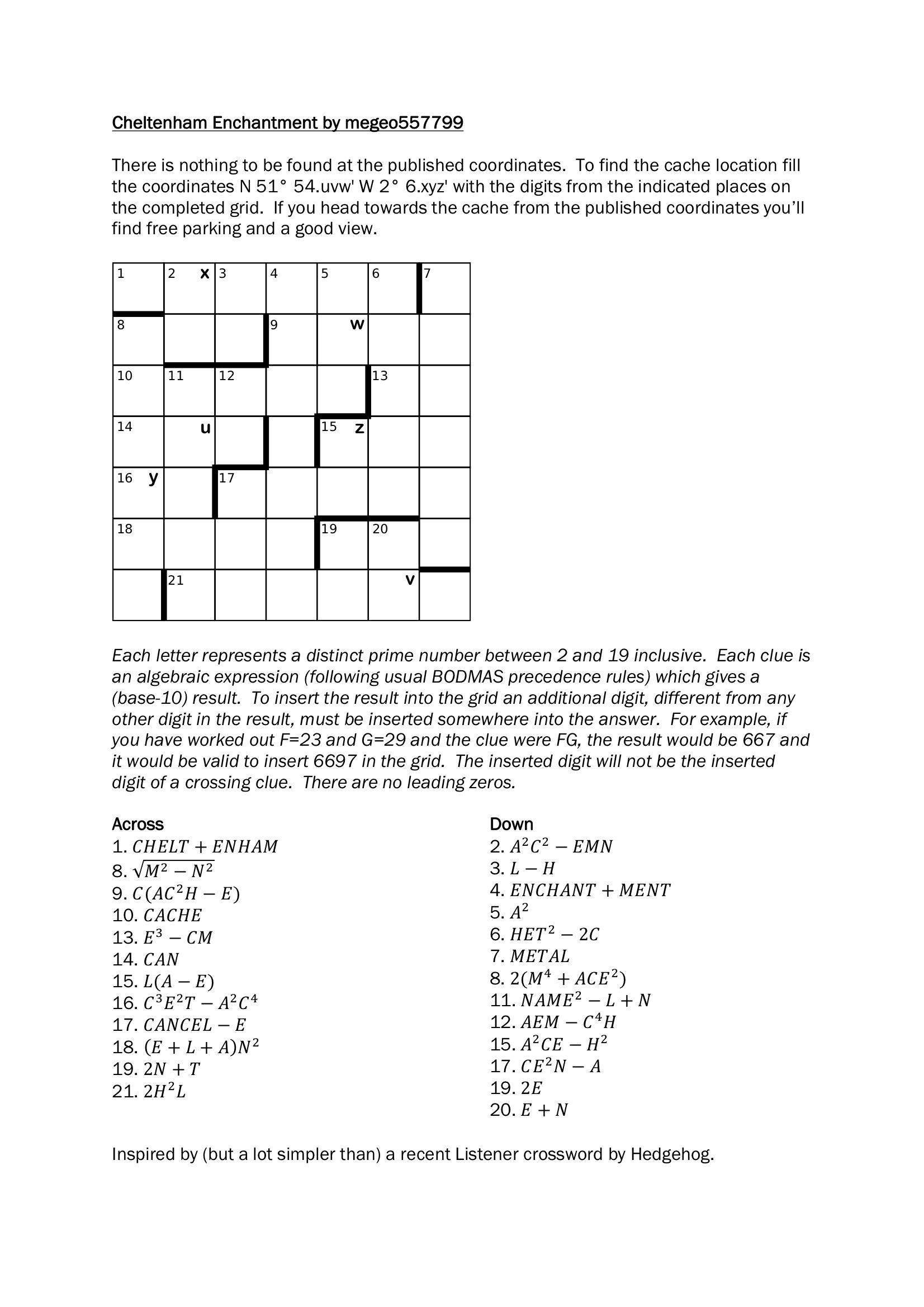 Each letter represents a distinct prime number between 2 and 19 inclusive. Each clue is an algebraic expression (following usual BODMAS precedence rules) which gives a (base-10) result. To insert the result into the grid an additional digit, different from any other digit in the result, must be inserted somewhere into the answer. For example, if you have worked out F=23 and G=29 and the clue were FG, the result would be 667 and it would be valid to insert 6697 in the grid. The inserted digit will not be the inserted digit of a crossing clue. There are no leading zeros.