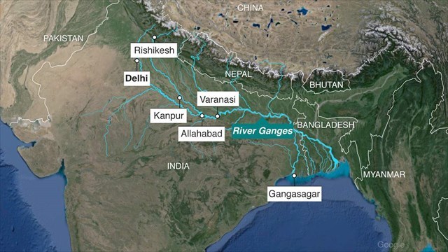 गंगा हिमालय से दक्षिण और पूर्व की ओर बहती है, जो पहाड़ को छोड़ते हुए एक घाटी बनाती है। अपनी संकीर्ण हिमालय घाटी से 160 मील की दूरी पर बहने के बाद, गंगा ऋषिकेश में पहाड़ों से निकलती है, फिर गंगा के मैदान में बहती है जहां यह उत्तरी भारत के माध्यम से अपना रास्ता बनाती है, अंततः बंगाल की खाड़ी में खाली हो जाती है।