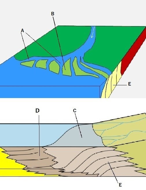 In the delta front (C) sands are usually deposited. In the prodelta (D) are deposited clays very rich in organic matter of continental origin. The repetition of growth cycles and the abandonment of the distributive ones produces this succession of conglomerate, sandstone and schist (E).