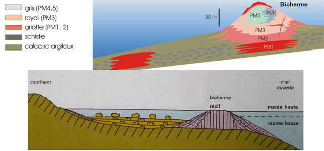 C'est de ces biohermes massifs qu'ont été extraits les marbres rouges (et certains gris) de Belgique. Ceux-ci s sont divisés en 3 groupes: les rouges foncés appelés "griotte" du nom de la variété de cerise, les rouges vifs qui eux aussi peuvent être subdivisés en rouge royal ou rouge impérial selon la présence plus ou moins importante d'éléments blanc et gris et finalement le rouge byzantin qui peut être facilement identifié grâce à la présence de veines blanches et de fossiles de coquillages entourés d'une fine ligne noire.