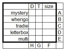Ze zijn allemaal een verschillend type, hebben een andere moeilijkheid, andere terreinwaarde en een ander formaat. Bij geen enkele cache is de D- en T-waarde gelijk.