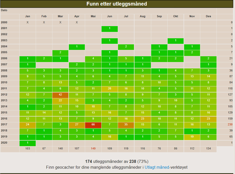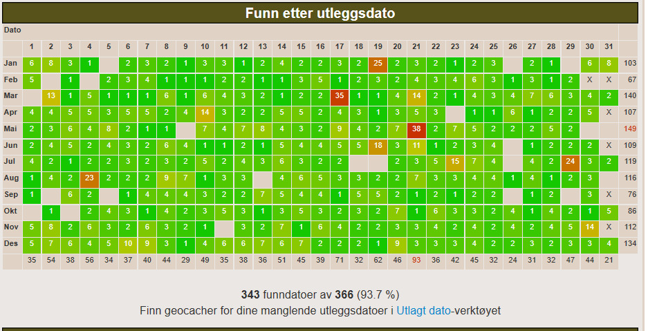 Når en geocache blir lagt ut så kommer datoen som står i beskrivelsen opp i feltene på bildet under her. Så når du er ute å logger en cache blir disse feltene fylt opp, avhengig av når gjeldene cache er lagt ut. Jo høyere tall det står i ruten, desto flere cacher er lagt ut på denne datoen. Du ser det ofte der det er lagt ut en PT (Powertrail), altså en løype med mange cacheutlegg på.