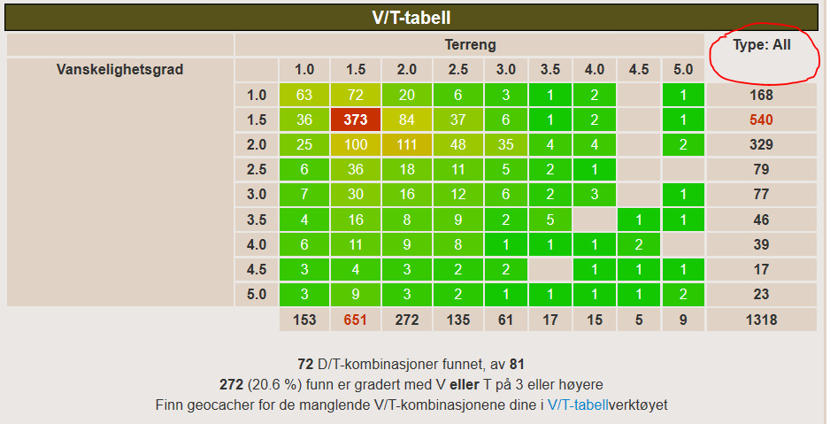 Tips: Den røde ringen viser at jeg har alle cachetypene, men om du trykker på feltet så ser du hvor langt du har kommet med hver av de ulike ikonene.