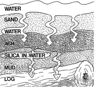 Petrified wood is not rare. It is found in volcanic deposits and sedimentary rocks at many of locations worldwide. It is sometimes found where volcanic activity covered plant material with ash, mudflows or pyroclastic debris. It is found where wood in sedimentary deposits was replaced by minerals precipitated from groundwater. It is especially abundant around coal seams, although many of the wood specimens in these locations are casts and molds rather than petrifications. One almost unbelievable material from Western Australia is known as "peanut wood" because of its ovoid markings, but those markings are actually boreholes drilled by a clam!
