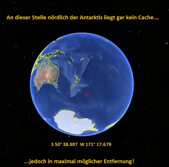 Angenommen, Gretas Papa hätte nicht gelogen, d.h. es gäbe keine Abplattung unserer Erde durch die Geschwindigkeit der Erdrotation und die dadurch bedingten Fliehkräfte und die Erde wäre eine ideale Kugel -abgesehen von Bergen und Tälern-, so liegt, für die Berechnung der Koordinaten, der Cache genau in maximal möglicher Entfernung zur folgenden Stelle *** S 50° 38.987 W 171° 17.679 *** [siehe auch Hinweisbild...]