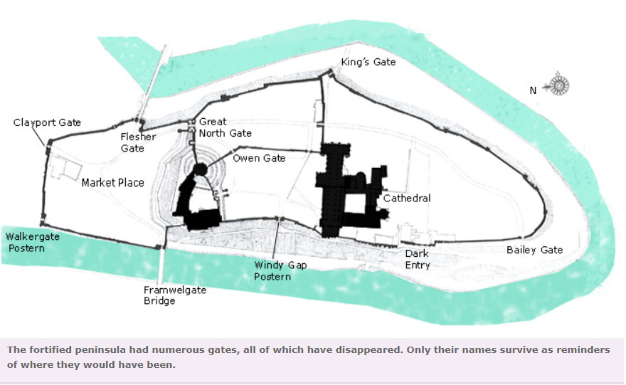 Two other gates were present in the walls, leading to fords across the river: Kings Gate (on modern Bow Lane) and Water Gate or Bailey Gate (at the southern end of South Bailey).