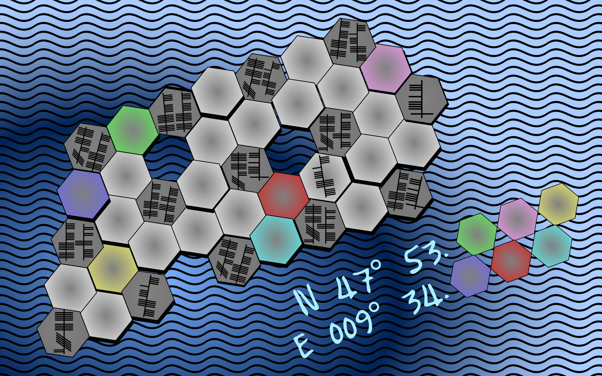 An einer besonders kniffligen Stelle, hatte er die wichtigsten Steine (dunkelgrau) schon gesetzt. Aus seinen Untersuchungen des Meeresgrundes und des Wellengangs wusste er, dass er nun die genau richtigen Härtegrade um die gesetzten Steine herum verteilen müsse. Die Summe der Härtegrade um die schon gesetzten, dunkelgrauen Steine, muss einer exakten Zahl entsprechen. Er notierte sich die jeweilige Zahl auf die dunkelgrauen Steine. Dabei durften sich die Härtegrade, die an denselben dunkelgrauen Stein grenzen, nicht wiederholen.