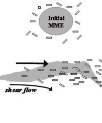Shear, can cause the MME to become elongated and lengthened in the direction of the shear flow, as is shown in the image.
