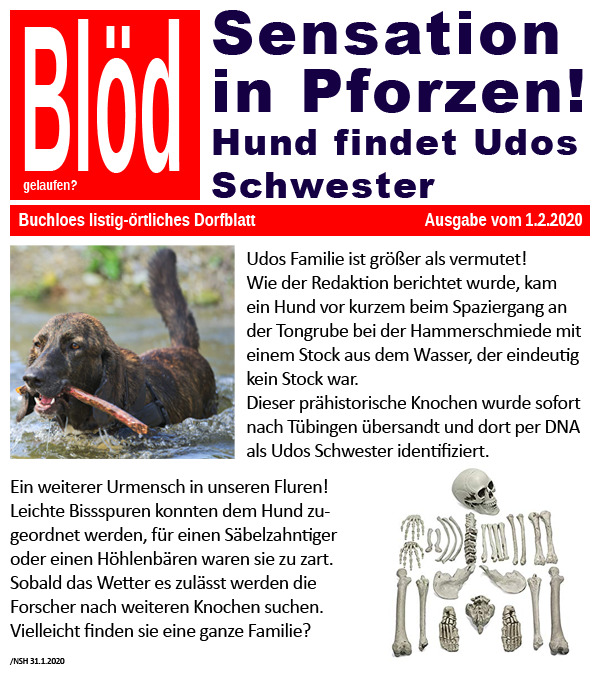 Wie unlängst auch die überregionale Presse ausführlich berichtete, wurden in einer Tongrube nahe Pforzen Knochen gefunden, die als der erste aufrecht gehende Frühmensch identifiziert wurden. Er wurde von seinem Entdecker auf den Namen "Udo" getauft.