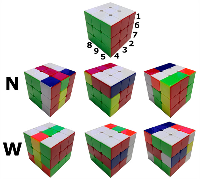 Example: Assuming the first cube equals 35, you turn the middle slice to bring the [green-yellow-yellow] area down with the rest of the reds (a "3" move), then you rotate the right-hand face up so the [white-white-white] line joins the rest of the white (a "5" move). There you go! Easy peasy... right?