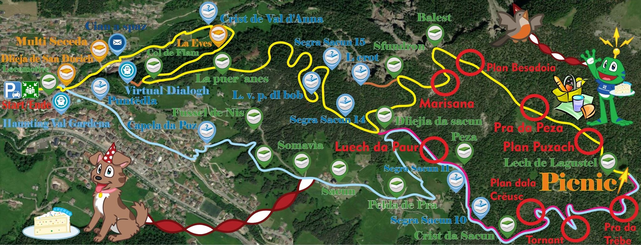 Il gruppo Gherdëina Geocacher organizza il quinto evento escursionistico in Val Gardena. Questa volta si parte da Ortisei attraverso la Val d’Anna fino al Col de Flam e poi fino a S. Giacomo. Da quí i buoni escursionisti saliranno fino al bellissimo punto panoramico Balest, invece gli altri possono semplicemente camminare lungo la strada sterrata fino al lago "Lech da Lagustel" (sperando che non sia già prosciugato a luglio) dove entrambi i gruppi si incontreranno di nuovo. Faremo un picnic quí, quindi portati una coperta o un tappetino per sdraiarti comodamente nel bellissimo prato. Come giá detto, mangeremo dallo zaino, quindi portati abbastanza provviste per l'intera giornata. Non dimenticare buone scarpe e protezione dalla pioggia in caso di necessità.