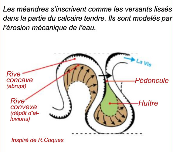 3 million years ago, the causse was a vast plain where the Vis meanders in large meanders. The causse then gradually rises, causing the river to sink into its bed at the same time, which nevertheless retains its sinuous course. (source: ecologists of Euzière)